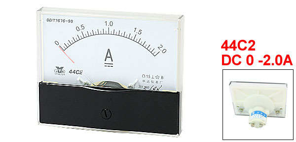Product Name Analog Ammeter Model No. 44C2 Measuring Current Range DC 0 -2.0A Accuracy Class 1.5 Operating Temperature -20~40°C Panel Size 10 x 8 x 1.2 cm / 4" x 3.1" x 0.5" (L*W*T) Thread Dia Long One 4 x 10 mm / 0.15" x 0.4"(Dia*L)
