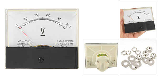 DC Voltage Panel Meter Model No. 44C2-V Scale Range DC 0~250V Accuracy Class 1.5 Back Screw Diameter 4mm/ 0.16" Panel Size 9.7 x 7.9 x 1.2cm/ 3.8" x 3.1" x 0.5" (L*W*T) Overall Depth 6.1cm/ 2.4" Color White & Black Main Material Plastic & Metal Net Weight 122g Package 1 x DC Voltage Panel Meter - Reviews
