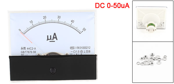 Product Name Analog Ammeter Model 44C2 Measuring Current Range DC 0-50uA Accuracy Class 1.5 Total Size 9.8 x 7.8 x 5.8cm/3.8" x 3.1" x 2.3"(L*W*T) Thread Dia. 4 x 9mm/0.16" x 0.35"(D*L), 3 x 8mm/0.12" x 0.315"(D*L) Color Clear, Black, White Net Weight 98g Package Content 1 x Analog Ammeter - Reviews