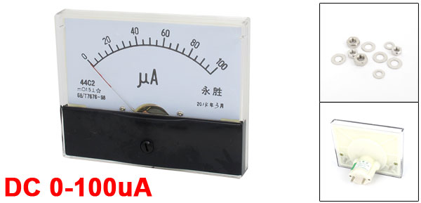 Product Name Analog Ammeter Model No. 44C2 Measuring Current Range DC 0-100uA Accuracy Class 1.5 Panel Size 99 x 79mm / 3.9" x 3.1" (L*W) Thread Dia 3mm/0.12"
