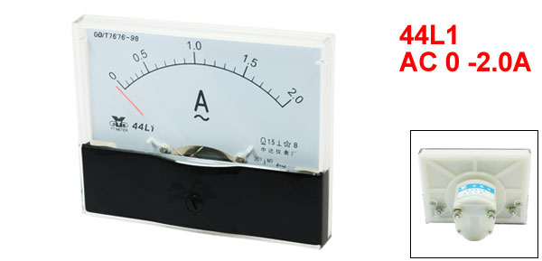Product Name Analog Ammeter Model No. 44L1 Measuring Current Range AC 0 -2.0A Accuracy Class 1.5 Operating Temperature -20~40°C Panel Size 10 x 8 x 1.2 cm / 4" x 3.1" x 0.5" (L*W*T) Thread Dia Long One 4 x 10 mm / 0.15" x 0.4"(Dia*L)