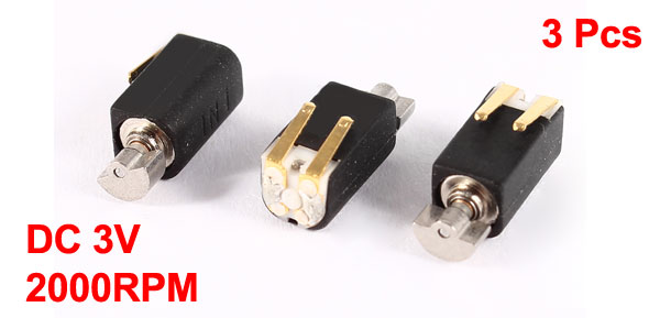Details4.4mm x 4.4mm x 8.2mm Black Electric 2000RPM Speed Vibration Motor DC3V 3 Pcs  Product Name DC Vibration Motor Working Voltage DC 3V Rated Speed 2000RPM Body Size 4.4 x 4.4 x 8.2mm / 0.17" x 0.17" x 0.32" (L*D) Main Color Silver Tone, Black Main Material Metal, Rubber Weight 3g Package3 3 x DC Vibration Motors
