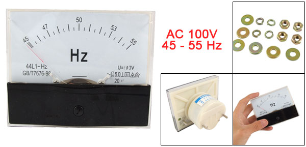 Product Name Frequency Meter Model 44L1 Type A.C. Accuracy Class 2.5 Voltage AC 100V Frequency 45 - 55 Hz Working Temperature -15 - +40 Celsius Degree Total Size 99 x 79 x 65mm/3.9'' x 3.1'' x 2.6'' (L*W*H) Base Size 57 x 52 x 40mm/2.2'' x 2'' x 1.6'' (L*W*H) Thread Dia. 4mm/0.16'' Material Pllastic Color Black, Clear Net Weight 123g Package Content 1 x Analog Frequency Meter