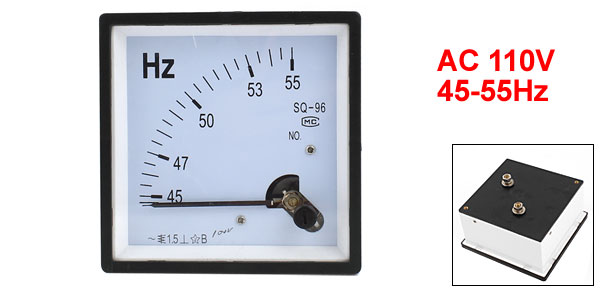 Product Name Frequency Panel Meter Model SQ-96 Type A.C. Accuracy Class 1.5 Voltage AC 110V Frequency 45-55Hz Total Size 96 x 96 x 50mm/3.7" x 3.7" x 2"(L*W*H) Screw Dia. 5mm/0.2", 2mm/ 0.08" External Material Plastic Main Color Black, White, Clear Weight 166g Package Content 1 x Analog Frequency Meter