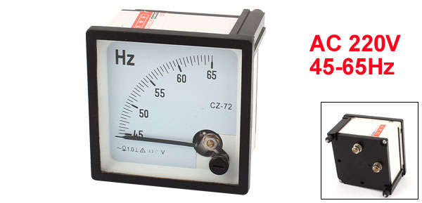 Product Name Frequency Panel Meter Model CZ-72 Type A.C. Accuracy Class ± 1.0 Voltage AC 220V Frequency 45-65Hz Total Size 72 x 72 x 58mm/2.8" x 2.8" x 2.3"(L*W*H) Screw Dia. 5mm/0.2", 2mm/ 0.08" External Material Plastic Main Color Black, White Weight 137g Package Content 1 x Analog Frequency Meter