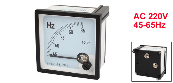 Product Name Frequency Panel Meter Model SQ-72 Type A.C. Accuracy Class ± 2.5 Voltage AC 220V Frequency 45-65Hz Total Size 72 x 72 x 58mm/2.8" x 2.8" x 2.3"(L*W*H) Screw Dia. 5mm/0.2", 2mm/ 0.08" External Material Plastic Main Color Black, White Weight 137g Package Content 1 x Analog Frequency Meter