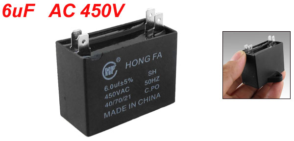 Product Name Capacitor Housing Material Plastic Capacitance 6uF Tolerance ± 5% Rated Voltage 450V AC Frequency 50Hz Pin Size 1 x 0.6cm / 0.4" x 0.24"(H*W) Total Size 4.8 x 3.4 x 2.3cm / 1.9'' x 1.34'' x 0.9" (L*W*H) Color Black Weight 40g Package Content 1 x Air Conditioner Capacitor - Reviews