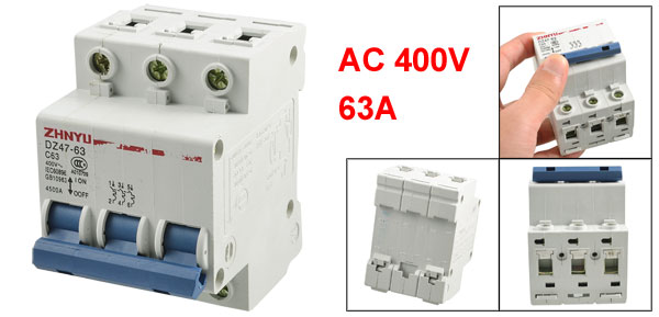 Product Name Circuit Breaker Model No. DZ47-63 C63 Material Plastic, Electric Components Main Color White, Blue Rated Voltage AC 400V Rated Current 63A Breaking Capacity 4500A Total Size (Approx.) 8 x 5.4 x 7.4cm / 3.2" x 2.1" x 2.9"(L*W*H) Number of Poles 3 Mount Type DIN Rail Weight 260g Package Content 1 x Circuit Breaker - Reviews
