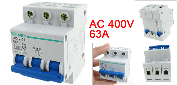 Product Name Circuit Breaker Model No. DZ47-63 C63 Material Plastic, Electric Components Rated Voltage AC 400V Rated Current 63A Breaking Capacity 4500A Frequency 50/60Hz Total Size (Approx.) 77 x 54 x 65mm/ 3" x 2.1" x 2.6" (L*W*H) Number of Poles 3 Mount Type DIN Rail Color As Picture Shown Weight 278g Package Content 1 x Circuit Breaker - Reviews