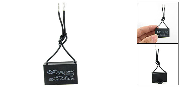 Product Name Motor Capacitor Housing Material Plastic Dielectric Material Metallized Polypropylene Film Model CBB61 Capacitance 1.5uF Tolerance 5% Rated Voltage 450VAC Frequency 50/60Hz Body Size 2.2 x 3.5 x 1.2cm/0.8" x 1.4" x 0.5" (H * W * T) Wire Length 9cm/3.5" Color As Picture Shown Weight 14g Package Content 1 x Motor Capacitor - Reviews
