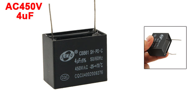 Product Name Motor Capacitor Housing Material Plastic Dielectric Material Polypropylene Film Model CBB61 Capacitance 4uF Tolerance 5% Rated Voltage 450V AC Frequency 50/60Hz Lead Spacing(Approx.) 3.1cm/1.2" Lead Length 2.2cm/0.87" Overall Size 3.8 x 3.2 x 2.2cm/1.5"x 1.3"x 0.8"(L*W*H) Color Black Weight 30g Package Content 1 x Motor Capacitor - Reviews