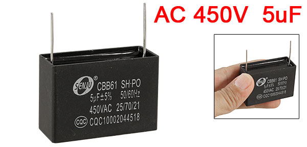 Product Name Motor Capacitor Housing Material Plastic Dielectric Material Polypropylene Film Model CBB61 Capacitance 5uF Tolerance 5% Rated Voltage 450V AC Frequency 50/60Hz Lead Spacing(Approx.) 4.2cm/1.7" Lead Length 2cm/0.8" Overall Size 4.8 x 2 x 5.1cm/1.9" x 0.8" x 2" (L*W*H) Color Black Weight 172g Package Content 1 x Motor Capacitor - Reviews