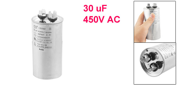 Product Name Motor Capacitor Model No. CBB65 Dielectric Material Metallized Polypropylene Film Housing Material Metal Capacitance 30 uF Tolerance 5% Rated Voltage 450V AC Frequency 50/60Hz Body Dimension 5 x 11.3cm/ 2" x 4.4" (D * H) Operating Temperature 40/70/21 Color Silver Tone Weight 205g Package Content 1 x Motor Capacitor - Reviews