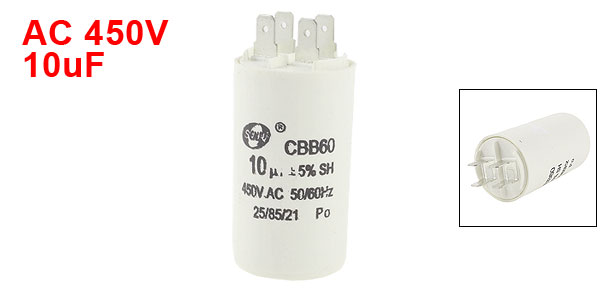 Product Name Motor Capacitor Housing Material Metal Dielectric Material Metallized Polypropylene Film Model CBB60 Capacitance 10uF Tolerance ±5% Rated Voltage 450V AC Frequency 50/60Hz Body Dimension 3.2 x 6.2cm/ 1.3" x 2.4"(D * H) Operating Temperature 25/85/21 Color White Net Weight 58g Package Content 1 x Motor Capacitor - Reviews