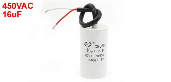 Product Name Motor Capacitor Housing Material Plastic Dielectric Material Metallized Polypropylene Film Model CBB60 Capacitance 16uF Tolerance ±5% Rated Voltage 450VAC Frequency 50/60Hz Temperature Coefficient 25/85/21 Body Size 4 x 7.3cm / 1.6" x 2.9" (D * H) Wire Length 21cm / 8.3" Color White, Black Weight 101g Package Content 1 x Motor Capacitor - Reviews