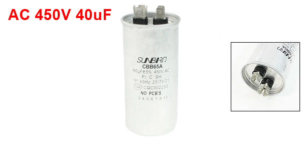 Product Name Motor Capacitor Model CBB65A Capacitance 40uF Tolerance ±5% Rated Voltage 450VAC Frequency 50/60Hz Operating Temperature 25/70/21 Body Size 5 x 10.5cm/2" x 4.1"(D * H) Housing Material Metal Dielectric Material Metallized Polypropylene Film Color Silver Tone Net Weight 203g Package Content 1 x Motor Capacitor - Reviews