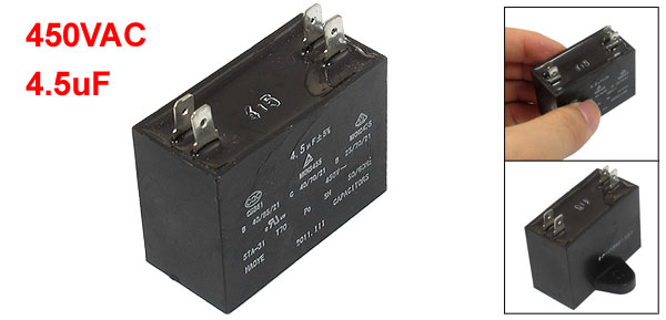 Product Name Capacitor Model CBB61 Dielectric Material Metallized Polypropylene External Material Plastic Rated Capacitance 4.5uF Tolerance 5% Rated Frequency 50/60Hz Rated Working Voltage 450VAC Pin Number 4 Mounting Hole Diameter 4.5mm / 0.18" Pin Size 8.4 x 4.8mm / 0.33" x 0.19" (L*W) Pin Spacing 31 x 5mm / 1.2" x 0.2" (L*W) Total Size(Approx) 4.7 x 3.6 x 4.4cm / 1.86" x 1.4" x 1.7" (L*W*H) Main Color Black Weight 46g Package Content 1 x Capacitor - Reviews