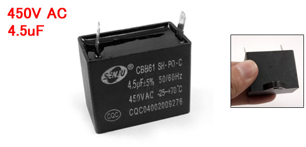 Product Name Motor Run SH Capacitor Model CBB61 Material Polypropylene Film Rated Capacitance 4.5uF Tolerance 5% Rated Frequency 50/60 Hz Working Temperature -25~70°C Rated Voltage 450V AC Overall Size 40 x 22 x 33mm/ 1.6" x 0.9" x 1.3"(L*W*H) Hole Dia 4mm/ 0.157" Pin Size 9 x 7mm/ 0.35" x 0.27"(L*W) Pin Spacing 31mm/ 1.22" Main Color Black Weight 34g Package Content 1 x Motor Run SH Capacitor - Reviews