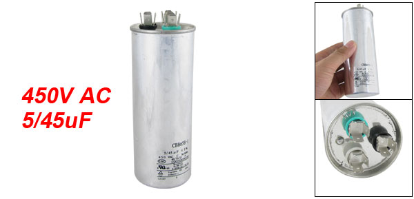 Product Name Motor Capacitor Model No. CBB65B-1 Dielectric Material Metallized Polypropylene Film Housing Material Metal Capacitance 5/45uF Tolerance 5% Rated Voltage 450V AC Frequency 50/60Hz Body Dimension 5 x 13cm/ 2" x 5.1" (D * H) Operating Temperature 40/70/21 Color Silver Tone Weight 236g Package Content 1 x Motor Capacitor - Reviews