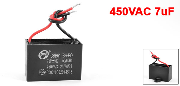 Product Name Motor Capacitor Model CBB61 Color Black External Material Plastic Dielectric Material Metalized Polypropylene Film Rated Capacitance 7uF Tolerance +/-5% Rated Frequency 50/60Hz Rated Voltage AC 450V Body Size 48 x 24 x 33mm/ 1.4" x 1" x 1.3"(L*W*T) Fixing Hole Diameter 4mm/0.15" Cable Length 10cm/ 3.9" Net Weight 43g Package Content 1 x Motor Capacitor - Reviews