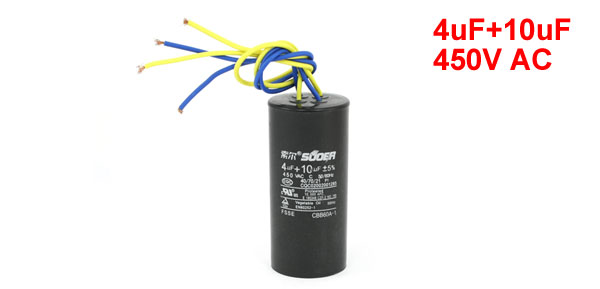 Product Name Motor Run Capacitor Material Polypropylene Film Model No. CBB60A-1 Rated Capacitance 4uF+10uF Tolerance 5% Rated Frequency 50/60 Hz Rated Voltage 450V AC Temperature Coeffcient 40/70/21 Body Size 9 x 4.2cm/3.5" x 1.65"(H*D) Cable Length 20cm/7.9" Main Color Black, Yellow, Blue Net Weight 115g Package Content 1 x Motor Run Capacitor - Reviews
