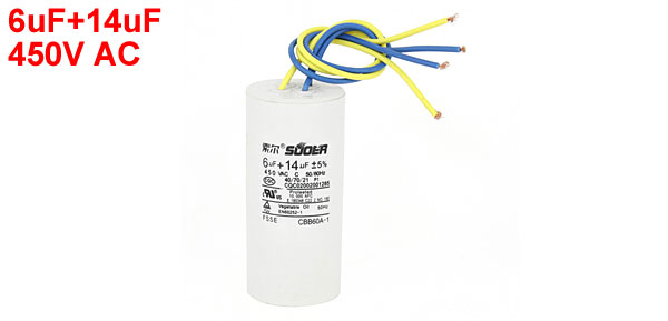 Product Name Motor Run Capacitor Material Polypropylene Film Model No. CBB60A-1 Rated Capacitance 6uF+14uF Tolerance 5% Rated Frequency 50/60 Hz Rated Voltage 450V AC Temperature Coeffcient 40/70/21 Body Size 9 x 4.2cm/3.5" x 1.65"(H*D) Cable Length 19cm/7.5" Main Color White, Yellow, Blue Net Weight 115g Package Content 1 x Motor Run Capacitor - Reviews