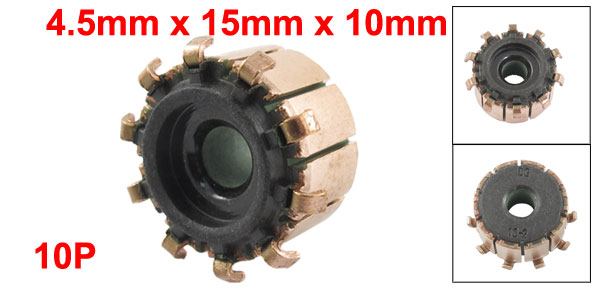 Product Name Motor Commutator Copper Bar Number 10P Total Length 4.5 x 15 x 10mm/0.2" x 0.6" x 0.4"(ID*OD*T) Material Copper, Feerite Color Copper Tone, Black Net Weight 4g Package Content 1 x Motor Commutator - Reviews