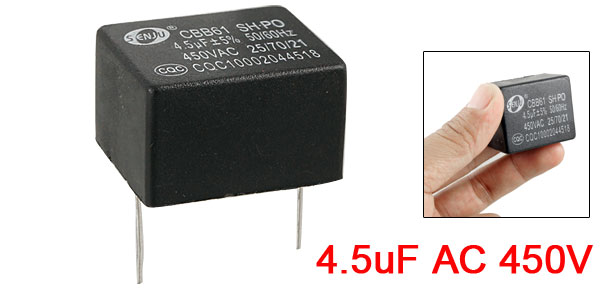 Product Name Motor Capacitor Housing Material Plastic Dielectric Material Polypropylene Film Model CBB61 Capacitance 4.5uF Tolerance ±5% Rated Voltage 450V AC Frequency 50/60Hz Lead Spacing(Approx.) 3.2cm/1.3'' Lead Length 2cm/0.8'' Overall Size 3.6 x 3 x 4.1cm/1.4'' x 1.2'' x 1.6'' (L*W*H) Color Black Weight 148g Package Content 1 x Motor Capacitor - Reviews