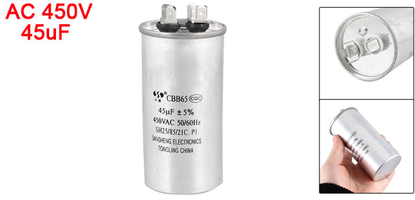 Product Name Motor Capacitor Model CBB65 Housing Material Metal Dielectric Material Metallized Polypropylene Capacitance 45uF±5% Rated Voltage AC 450V Frequency 50/60Hz Total Size(Approx) 10 x 5cm / 3.9" x 2" (H*D) Color Silver Tone Weight 191g Package Content 1 x Motor Capacitor - Reviews