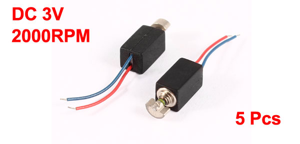 Product Name DC Vibration Motor Working Voltage DC 3V Rated Speed 2000RPM Body Size 4.8 x 4.6 x 8.2mm / 0.19" x 0.18" x 0.32" (L*W*H) Wire Length 14mm / 0.55" Main Color Silver Tone, Blue Main Material Metal, Rubber Weight 5g Package 5 x DC Vibration Motors - Reviews