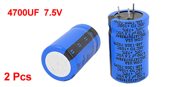 Product Name Solid Capacitor Type Radial Terminal Number 3 Voltage 7.5V Capacitance 4700uF Size 25 x 48mm/ 1" x 1.9" (D*L) Lead Dia 1mm Lead Length 5.5mm External Material Aluminum Weight 45g Main Color Blue,Black Package Content 2 x Solid Capacitors - Reviews