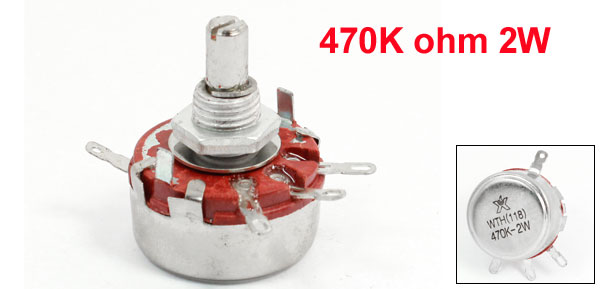 Product Name Carbon Potentiometer Model WTH118 Technology Carbon Composition Rated Power 2W Resistance Value 470K ohm Turn Number Single Turn Terminals Number 4 Features Round Shaft Body Size 28 x 16mm / 1.1" x 0.63"(D * H) Screw Thread Dia. 10mm / 0.4" Shaft Diameter 6mm / 0.24" Shaft Length 10mm / 0.4" Total Length 35mm / 1.4" Color Red, Silver Tone Net Weight 22g Package Content 1 x Carbon Potentiometer - Reviews