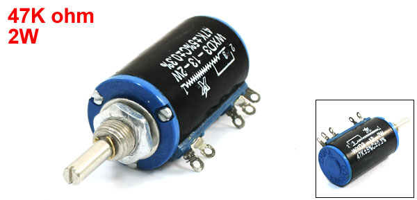 Product Name Wire Wound Potentiometer Model WXD3-13 Type Multiturn Technology Wire Wound Terminal Number 5 Rated Power 2W Resistance Value 47K ohm Tolerance ±5% Body Size 36 x 20mm / 1.4" x 0.8"(L * D) Screw Thread Dia. 8mm / 0.31" Shaft Diameter 4mm / 0.16" Shaft Length 12mm/0.47" Total Length 58mm/ 2.3" Color Black, Blue, Silver Tone Weight 23g Package Content 1 x Wire Wound Potentiometer - Reviews