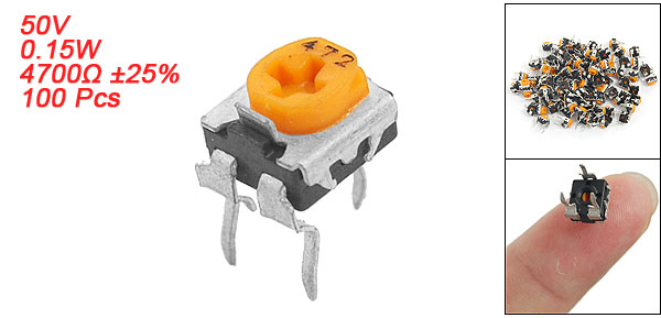 Details4.7K Ohm 472 Trimmer Potentiometers Pot Resistors 100 Pcs  Product Name Variable Resistor Trimmer Potentiometer Max. Operating Voltage 50V Power Rating 0.15W Resistance Value 4700 Ohm Resistance Tolerance ±25% Mounting Type Through Hole (DIP) Resistive Material Carbon Film Square Body Size 6.6 x 6.6mm / 0.26" x 0.26" (L*W) Pin Size (Each) 0.8 x 7mm / 0.03" x 0.28" (W*L) Pin Pitch 4 x 5mm / 0.16" x 0.2" Color As Picture Shown Weight 38g Package Content 100 (±2%) x Variable Resistors Trimmer Potentiometers