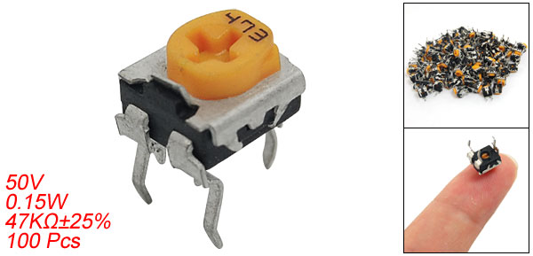Product Name Variable Resistor Trimmer Potentiometer Max. Operating Voltage 50V Power Rating 0.15W Resistance Value 47K Ohm Resistance Tolerance ±25% Mounting Type Through Hole (DIP) Resistive Material Carbon Film Square Body Size 6.8 x 6.8mm / 0.27" x 0.27" (L*W)
