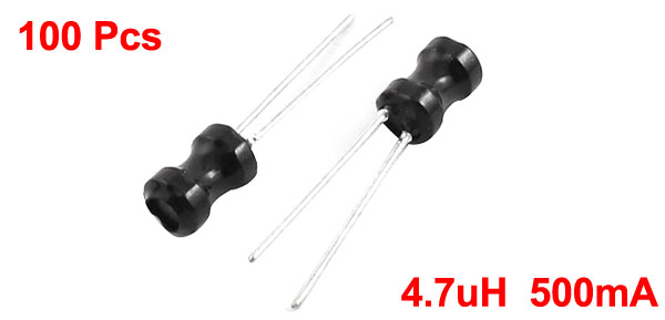 Product Name Radial Lead Inductor Inductance 4.7uH Rating Current 500mA Tolerance 10% Body Size 4 x 6mm / 0.16" x 0.24"(D*H) Pin Size 0.5 x 14mm/ 0.2" x 0.55"(D*L) Lead Distance 2mm / 0.08" Color Black, Silver Tone Weight 30g Package Content 100Pcs(±2%) x Radial Lead Inductor - Reviews