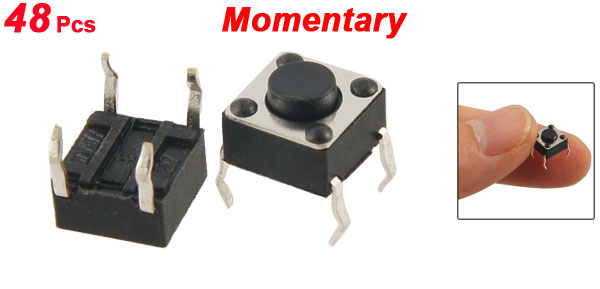 Product Name Tact Switch Contact Type Momentary Contact Dimension 6 x 6 x 4mm / 0.24" x 0.24" x 0.15" (L*W*H) Button Dia. 4.5mm / 0.18" Pin Pitch 6.5 x 4.5mm / 0.26" x 0.18" (L*W) Pin Length 5mm / 0.2" Material Plastic, Metal, Electric Parts Color Black, Silver Tone Net Weight 14g Package Content 48 x Tact Switches - Reviews