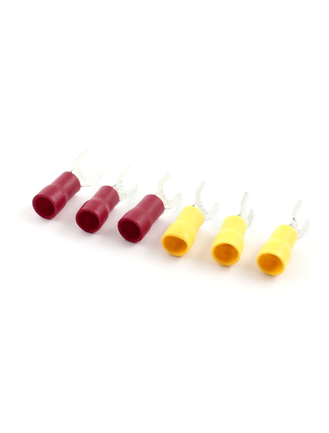 SVS5.5-6: 6.4mmConnecting Hole Size 6.4mm/0.25" Total Length 25.2mm / 1" Material Metal Color Red, Yellow Weight 478g Package Content 480 Pcs(+/-2%) x Fork Terminals - Reviews