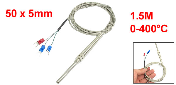 Product Name Thermocouple Transfer Type PT100 Temperature Range 0-400 Celsius Probe Size 50 x 5mm / 2" x 0.2" (L*D) Thread Dia 8mm / 0.31" Wire Length 1.5 Meters / 4.9Ft External Material Plastic, Metal Fork Terminal Quantity 3 Fork Terminal Spacing 4mm / 0.15" Color Silver Tone, Red, Blue Weight 38g Package Content 1 x Thermocouple - Reviews