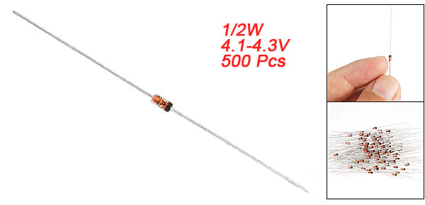 Product Name Zener Diodes Model No. 4C2 Rating Power 1/2 W Zener Voltage 4.1-4.3V Size(Not Include Leads) 0.35 x 0.18cm / 0.138" x 0.071"(L*D) Leads Dia(Approx) 0.04cm / 0.016" Overall Length(Approx) 6cm / 2.4" Color See the Picture Weight 56g Package Content 500(±2%) Pcs of Zener Diodes - Reviews