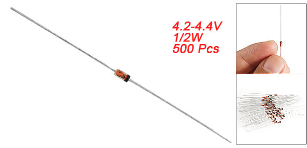 Product Name Zener Diodes Model No. 4C3 Rating Power 1/2 W Zener Voltage 4.2-4.4V Size(Not Include Leads) 0.35 x 0.18cm / 0.138" x 0.071"(L*D) Leads Dia(Approx) 0.04cm / 0.016" Overall Length(Approx) 6cm / 2.4" Color See the Picture Weight 62g Package Content 500(±2%) Pcs of Zener Diodes - Reviews