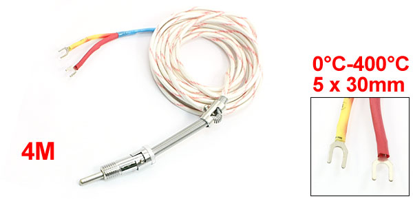 Product Name Thermocouple Type E Type, Tension Spring Sleeve Temperature Range 0°C-400°C Probe Size 5 x 30mm/ 0.2" x 1.2" (D*L) Thread Diameter 12mm/ 0.47" Cable Length 4M / 13.1Ft Material Metal, Nylon Net Weight 103g Package Content 1 x Thermocouple - Reviews