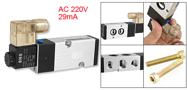 Product Name Solenoid Valve Model 4M310-10 Action Type Internally Guide Type 5 Ways 2 Positions Material Metal, Plastic Power Consumption AC 220V 50Hz 6VA; AC 220V 60Hz 4.5VA Current 29mA Operating Pressure 1.5 ~ 8 kgf/cm2 Temprature >35°C Port Inner Dia.(Each) 15 x 11.5mm/ 9/16" x 15/32" Hex Connector Inner Dia 10mm / 7/16" Total Size 13.5 x 7 x 2.6cm / 5.3" x 2.7" x 1" (L*W*T) Color As Picture Shown Weight 299g Package Content 1 x Solenoid Valve 2 x Screw - Reviews