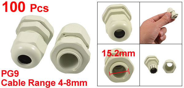 Product Name Cable Gland Model PG9 Cable Range 4-8mm / 0.16"- 0.3" Thread O.D. 15.2mm / 0.59“ Thread Length 8mm / 0.3” Total Size 22 x 33mm / 0.87" x 1.3" (D*H) Material Plastic Color White Weight 750g Package Content 100(±2%) x Cable Gland - Reviews