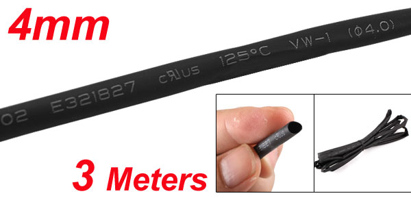 Details4mm Black Heat Shrinkable Tube Shrink Tubing 3 Meters 9.8ft  Product Name Heat Shrinkable Tube Material Polyolefin Rated Voltage 600V Temperature Level 125°C Flammability VW-1 Diameter 4mm / 0.16" (Before Shrinking) 2mm / 0.08"(After Shrinking) Shrink Ratio 2:1 Length (Approx.) 3 Meters / 118.1" Color Black Weight 15g Package Content 1 x Heat Shrinkable Tube
