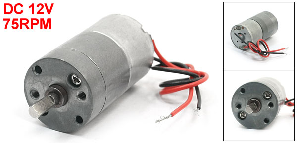 Details4mm Drive Shaft 75 r/min Cylindrical Geared Box Electric Motor DC 12V  Product Name Geared Box Motor Rated Voltage DC 12V Motor Rotary Speed 75RPM Wire Length 15.5cm/6.1" Box Shaft Size 4 x 12mm/ 0.16" x 0.47"(D*L) Female Thread Diameter 2.5mm/ 0.1" Motor Body Size 18 x 24mm/0.71" x 0.94"(L*D) Gear Box Size 25 x 25mm/1" x 1"(L*D) Main Color Gray Main Material Metal Weight 73g Package 1 x Geared Box Motor