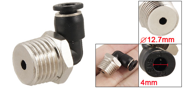 Product Name Pneumatic Quick Fittings Type Elbow Type One Touch Connector 4mm/ 5/32" Thread Connector 12.7mm/ 1/2" Material Plastic & Metal Size (Approx) 2.1 x 2.3 x 1.6cm/ 0.83" x 0.91" x 0.63" (L*W*T) Color Black, Silver Tone Weight 15g Package Content 1 x Pneumatic Quick Fittings - Reviews