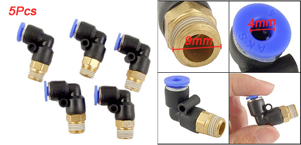 Details4mm Push In Tube Pneumatic Parts Elbow Connector 5 Pcs  Product Name Pneumatic Quick Coupler Material Plastic, Metal Thread Diameter 9mm/0.35'' Inner Diameter (Blue End) 4mm/0.12'' Total Size (Each ) 30 x 24 x 13mm/1.2'' x 0.9'' x 0.5'' (L*W*T) Color Black, Blue, Gold Tone Weight 42g Package Content 5 x Pneumatic Quick Coupler