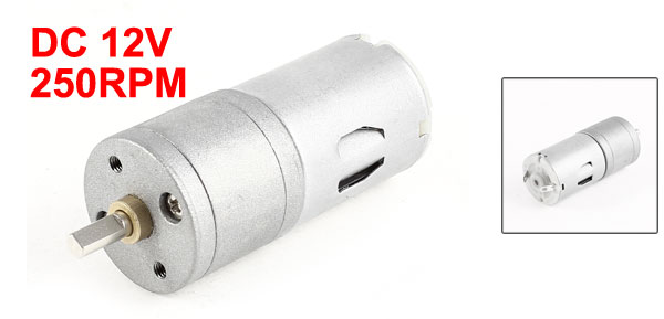 Product Name Motor Rated Voltage DC 12V No-load Speed 250RPM Shaft Dia 4mm/0.16" Shaft Length 9.5mm/0.37" Body Size 58 x 25mm / 2.3" x 1.0" (L*D) Total Length 68mm / 2.7" Main Color Silver Tone Material Metal Weight 54g Package 1 x Gear Box Motor - Reviews