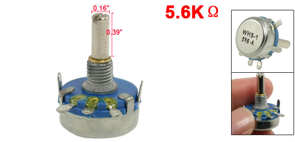 Product Name Potentiometer Model No. WH5-1 Resistance Value 5.6K ohm Adjustment Type Top Adjustment Type Single Linear(Type A) Features Split Shaft Shaft Diameter 4mm / 0.16" Shaft Length 10mm / 0.39" Threaded Collar Diameter 6mm / 0.23" Base Height 9mm / 0.35" Base Diameter 18mm / 0.71" Material Metal w Electronic Parts Color As Picture Show Weight 7g Package Content 1 x Potentiometer - Reviews